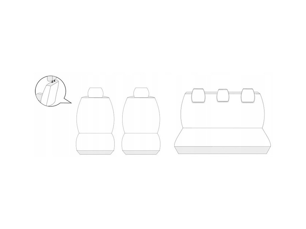 - první řada: 2 potahy na přední sedadla, 2 opěrky hlavy