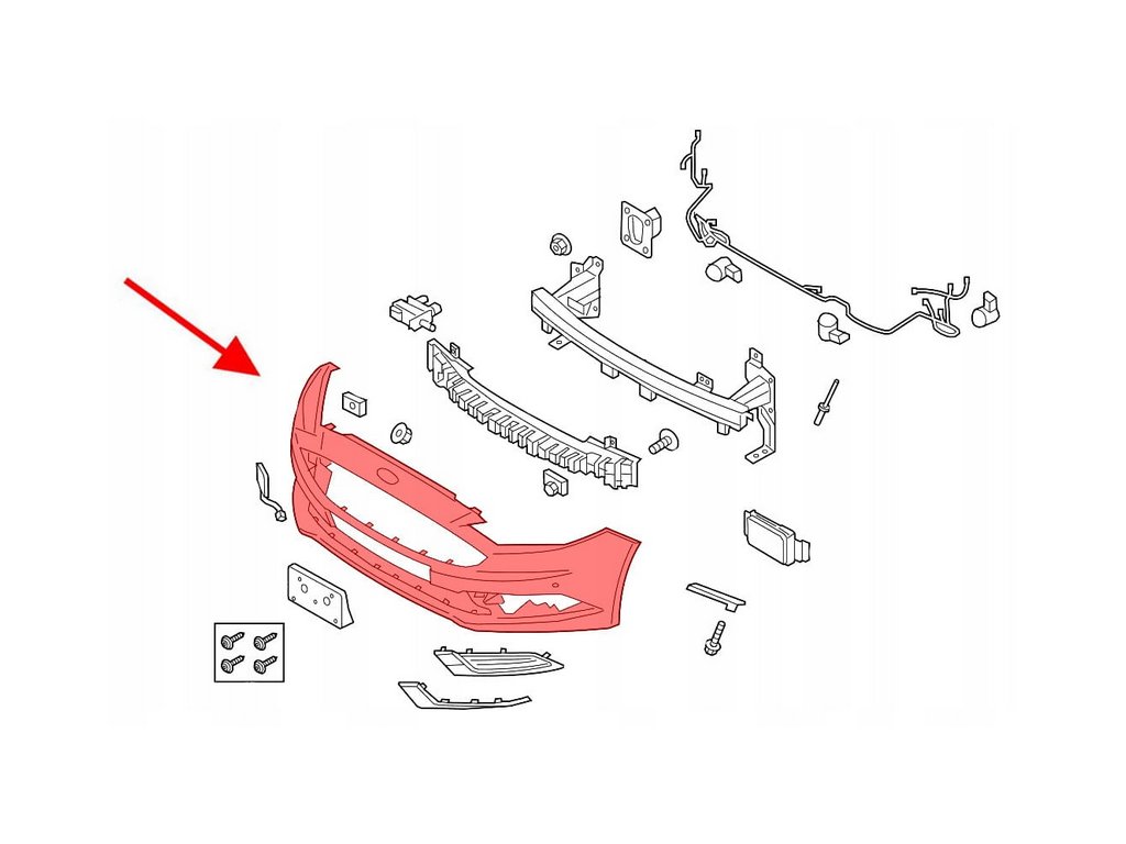 Přední nárazník. Má otvory pro parkovací senzory, pro mlhovku a otvor pro tažné zařízení.