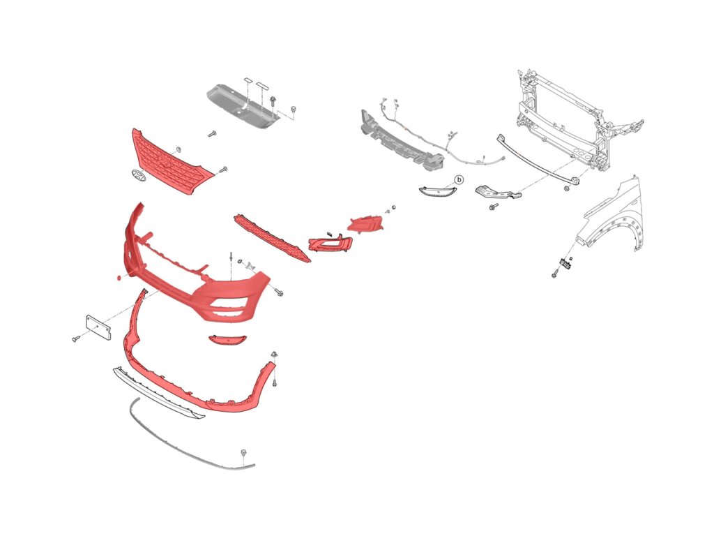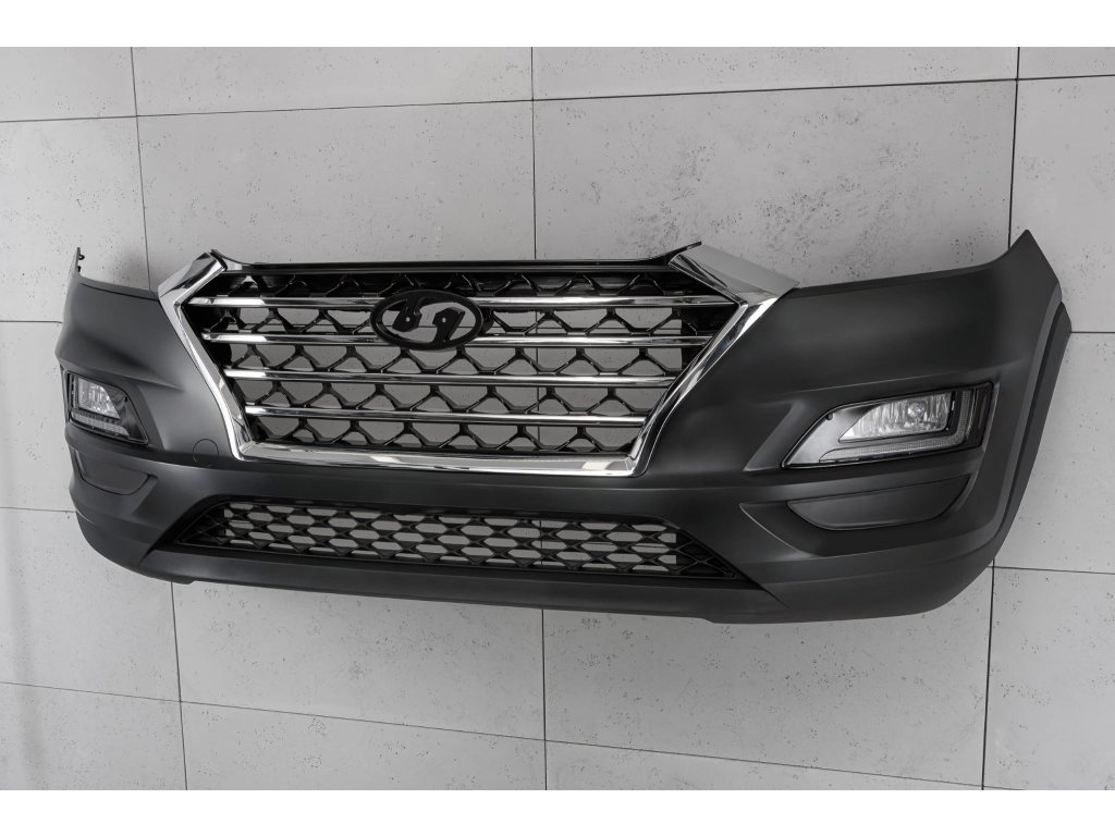 | Přední nárazník s chromovanou mřížkou a mlhovými světlomety s LED světly pro denní svícení DRL, určený pro HYUNDAI TUCSON III (TL) 2018-2020 (verze po faceliftu). Sada obsahuje: