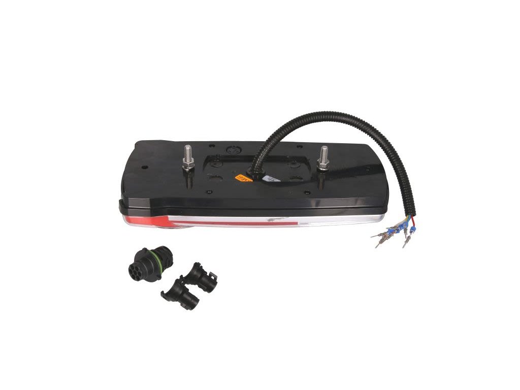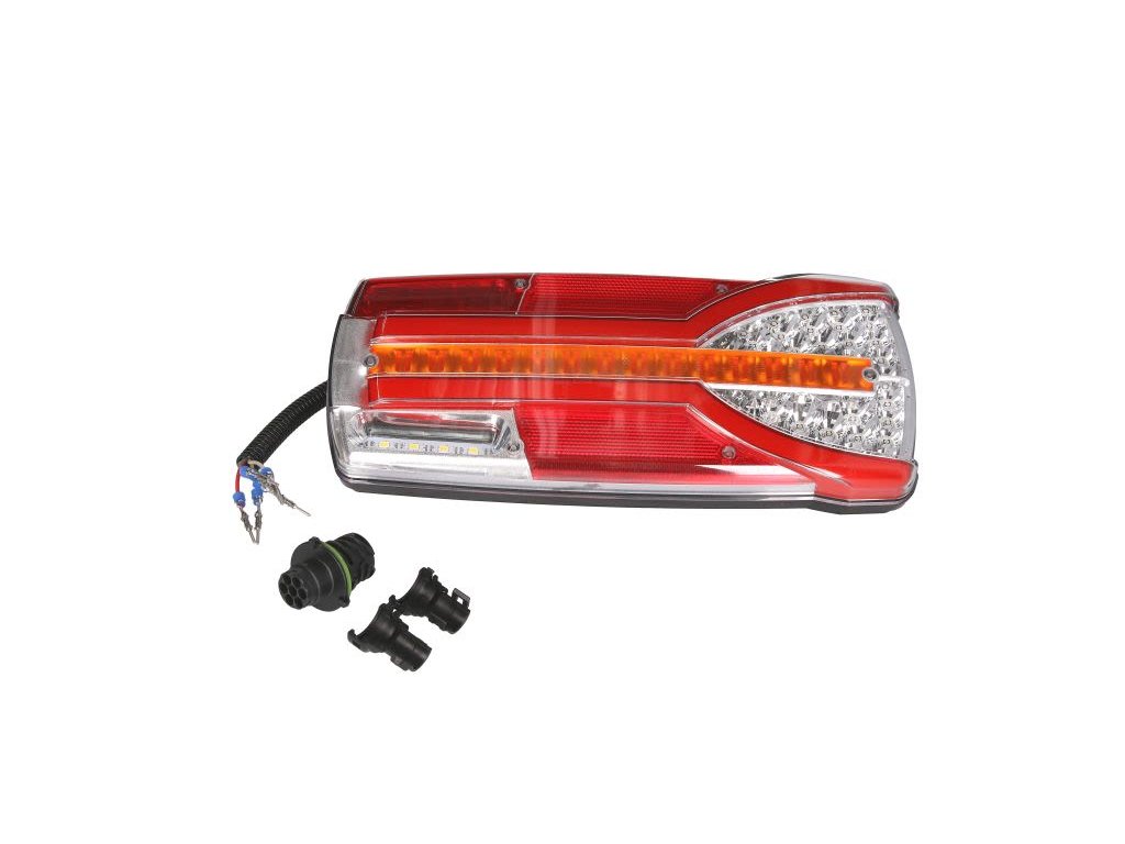 - Zadní světlo pravé CARMEN (LED, 12/24 V, s ukazatelem směru, mlhovým světlem, couvacím brzdovým pozičním odrazkou, konektor: EURO AMP 7PIN, bílé brzdové sklo)